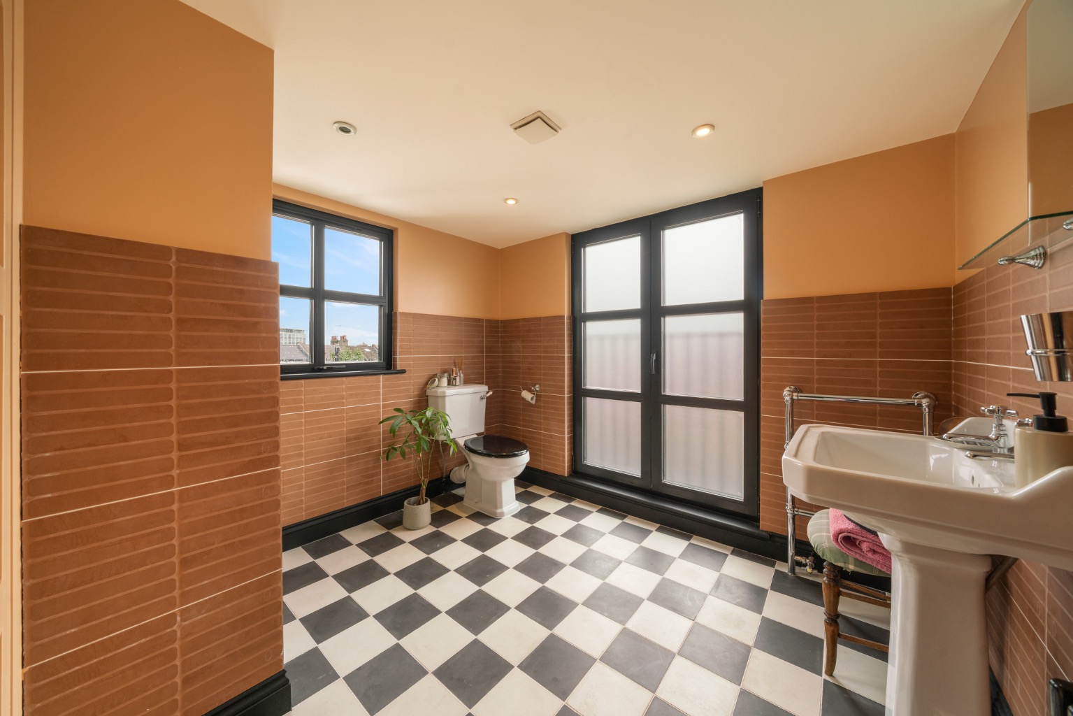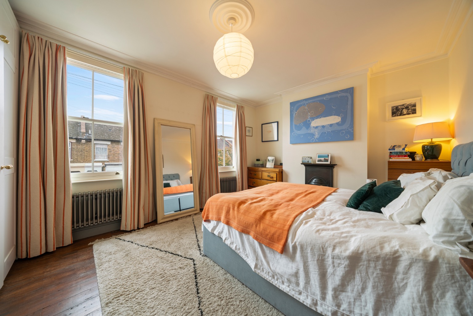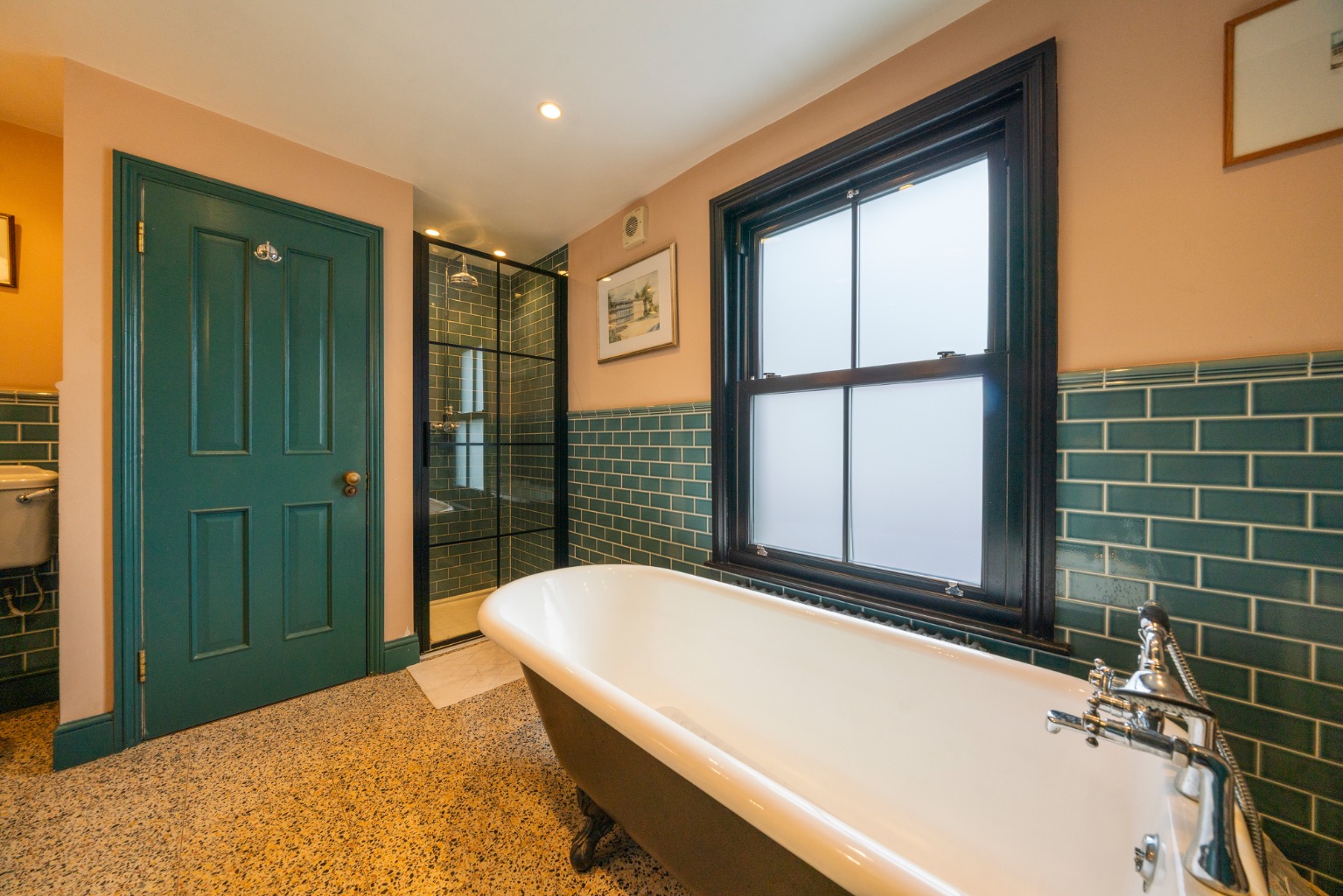 Configured as a generous three double-bedroom home, the layout has cleverly transformed what would traditionally be a small “box room” into a luxurious family bathroom — complete with bespoke storage, a roll-top standalone tub, and a separate shower. The second floor features an additional shower room with Juliet balcony doors, Bert & May chequerboard tiles, and warm terracotta walls. All bedrooms benefit from excellent fitted storage, high ceilings, and wonderful natural light throughout.