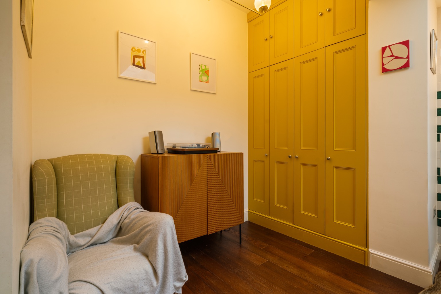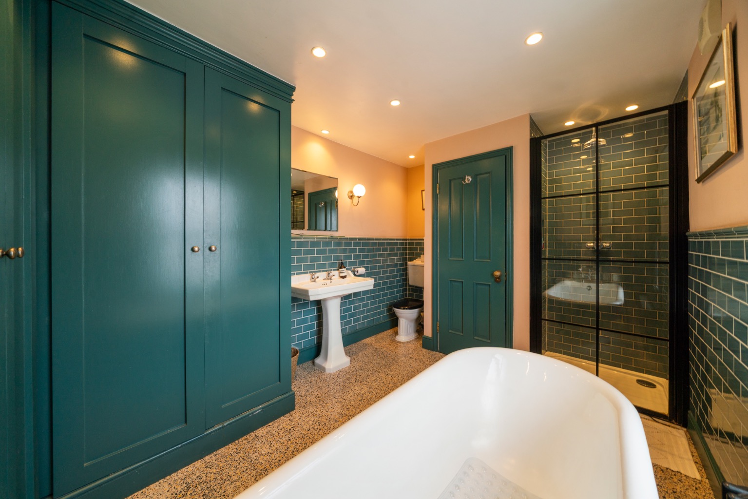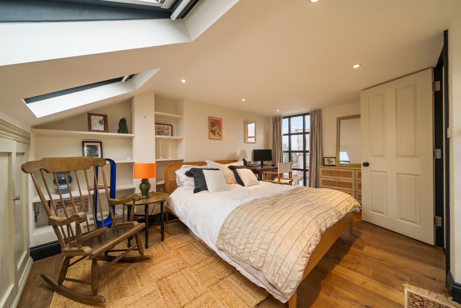 Configured as a generous three double-bedroom home, the layout has cleverly transformed what would traditionally be a small “box room” into a luxurious family bathroom — complete with bespoke storage, a roll-top standalone tub, and a separate shower. The second floor features an additional shower room with Juliet balcony doors, Bert & May chequerboard tiles, and warm terracotta walls. All bedrooms benefit from excellent fitted storage, high ceilings, and wonderful natural light throughout.