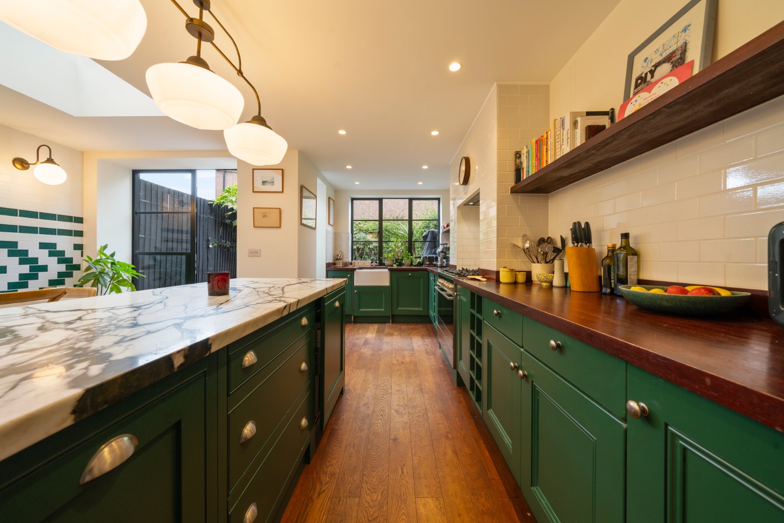 On the ground floor, a charming living room features high ceilings, original wooden floors, and bespoke cabinetry centred around a fireplace. At the rear, an incredibly stylish kitchen/dining room boasts a dark green shaker-style kitchen with a large island topped with a stunning piece of marble. Above the dining area, a skylight floods the space with natural light. The tiled feature wall hints at an Art Deco influence, enhanced by carefully chosen wall lights and pendant lights above the island. Double doors open onto a low-maintenance garden, surrounded by mature plants and trees offering excellent privacy.