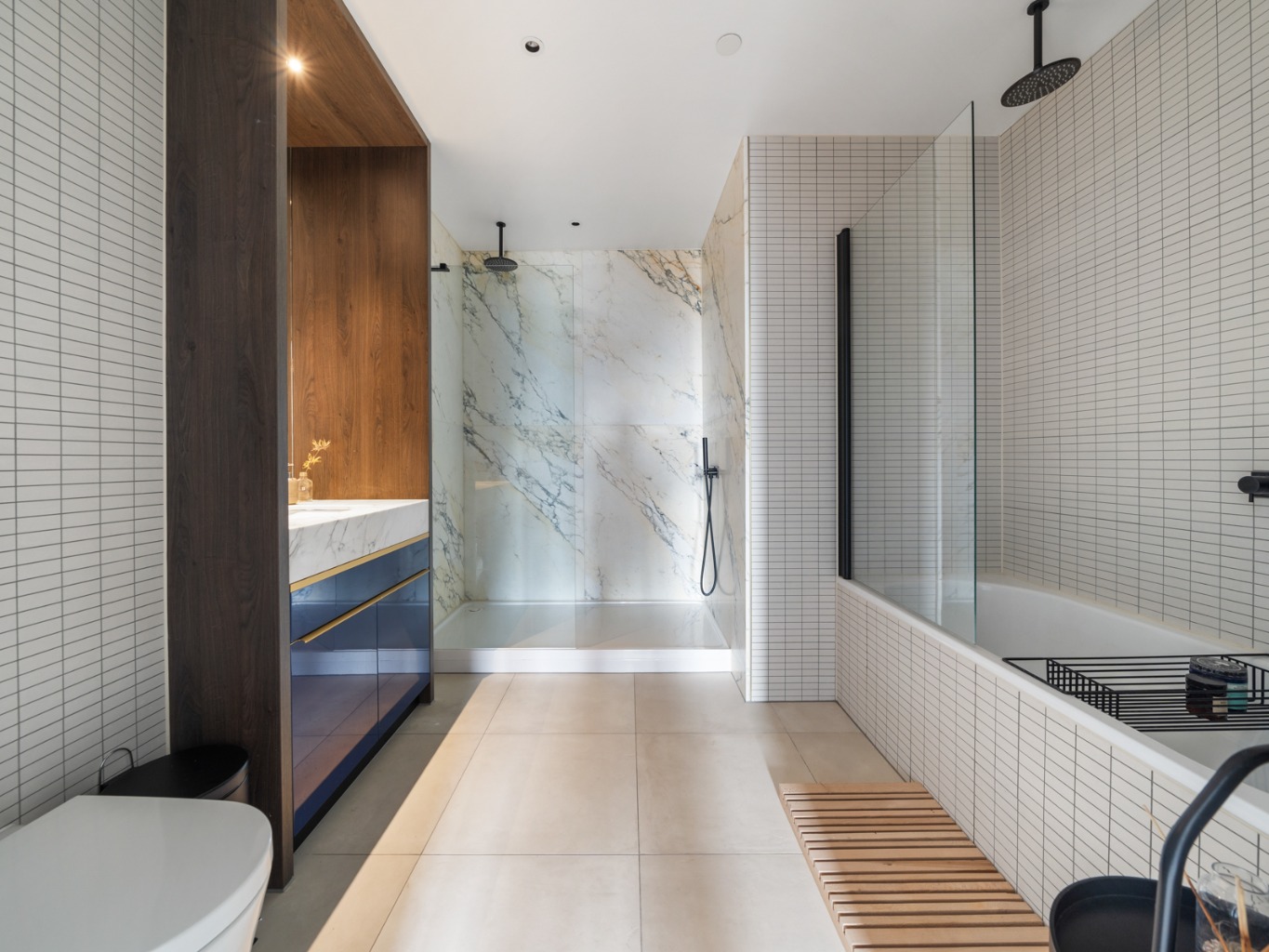 Every detail has been meticulously selected to deliver both style and quality. The kitchen is finished with herringbone flooring, quartz worktops, and premium Miele appliances. Bathrooms evoke a spa-like atmosphere, featuring honed Italian marble, porcelain mosaic tiling, sleek black brassware, heated towel rails, and bespoke vanity units. Bedrooms are finished with soft broadloom carpets and fitted with custom Italian wardrobes by Lema, complete with smoked oak veneer and refined brass accents.