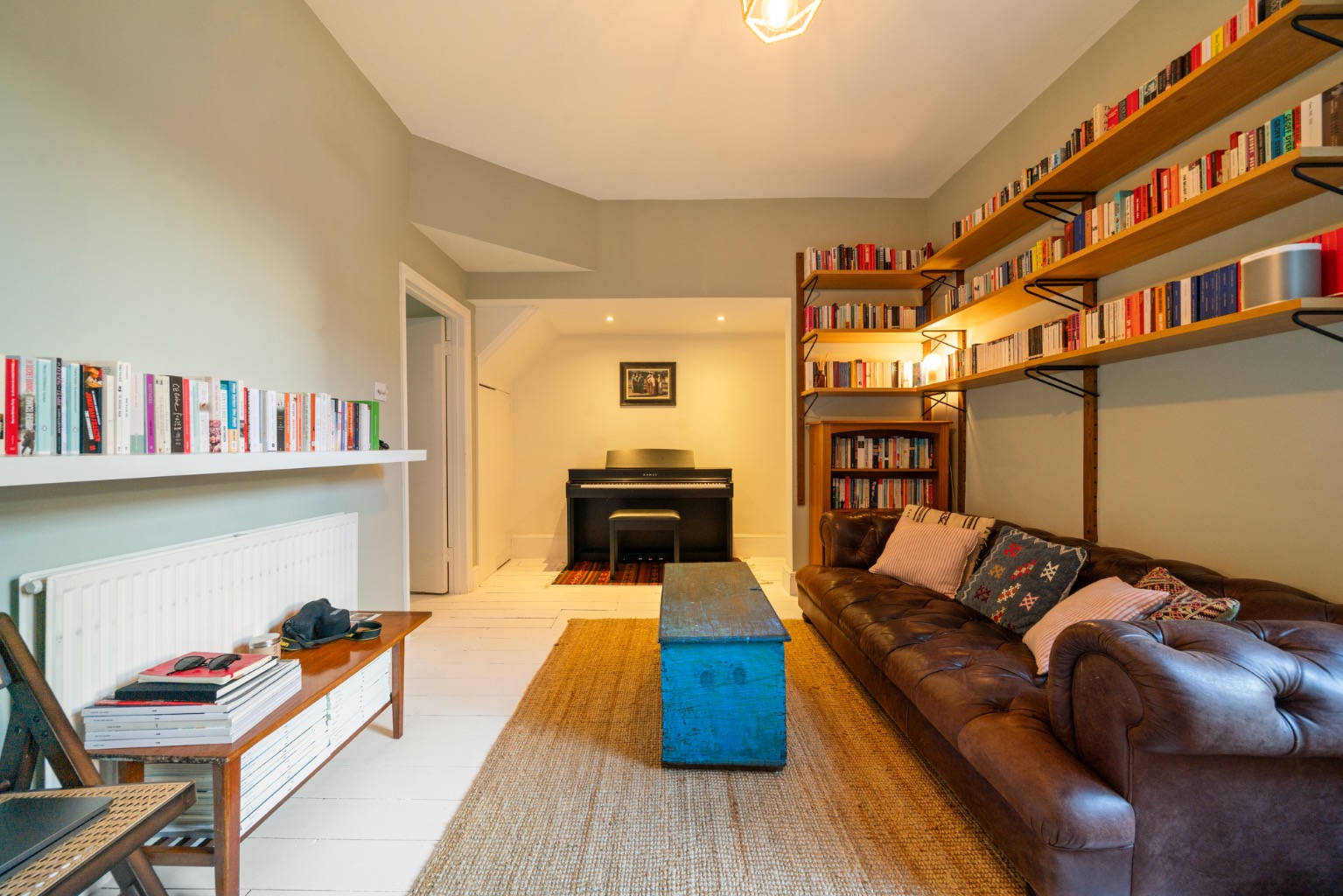 At the heart of the apartment is a cosy living area with bespoke library shelving and a charming window seat with storage, offering the perfect spot to relax and enjoy views of the garden.
