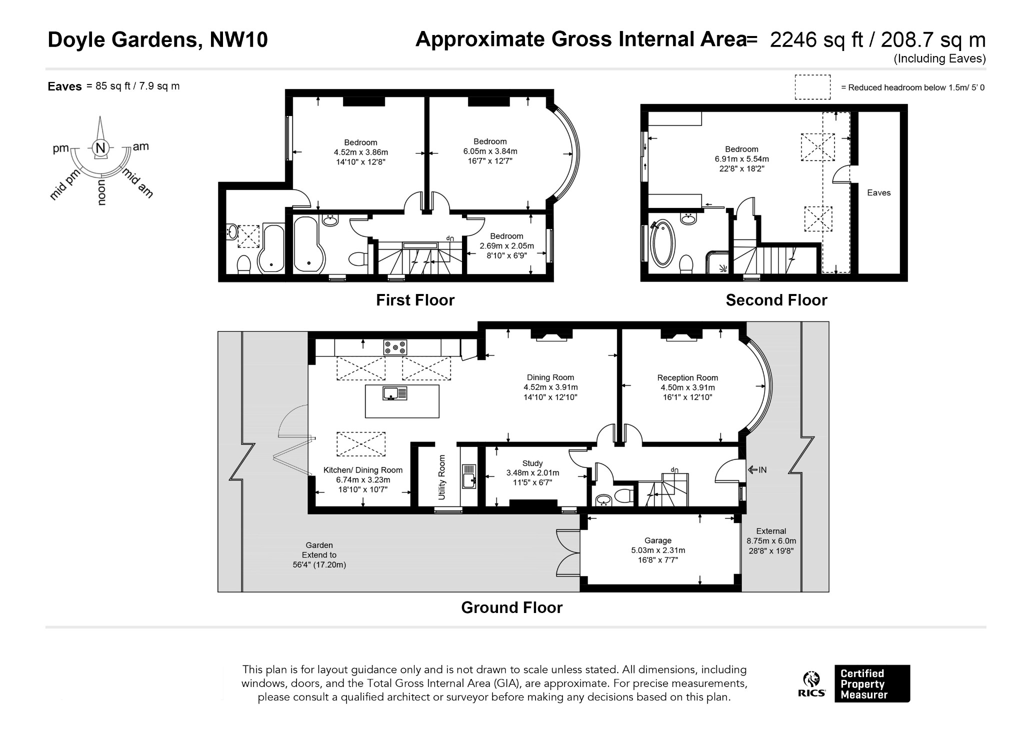 Upstairs on the first floor are two large double bedrooms, both with fitted wardrobes, two bathrooms (one en suite to the rear-facing bedroom), and a well-sized single bedroom.