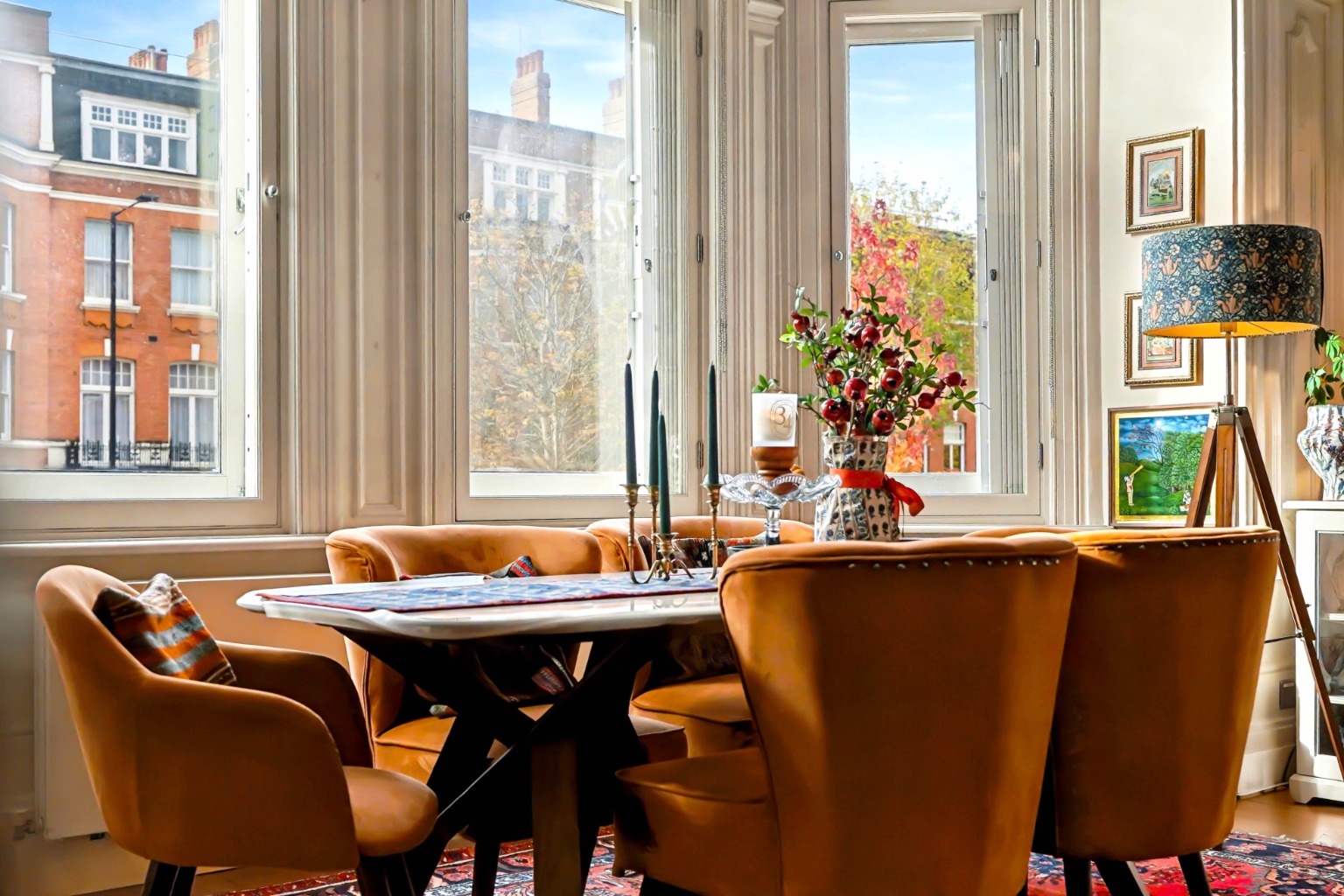 Upon entering, you are immediately struck by the impressive sense of space and light, characteristic of properties of this calibre. The apartment benefits from magnificent high ceilings throughout, enhancing the feeling of grandeur and airiness. The reception room, a generous and inviting space, is bathed in natural light streaming through large bay windows, which also offer charming views of the surroundings. This room provides an ideal setting for both relaxed evenings and entertaining guests, with ample space for comfortable seating and dining arrangements. The original cornicing, meticulously preserved, adds a touch of historical elegance and character, seamlessly blending with the modern aesthetic.