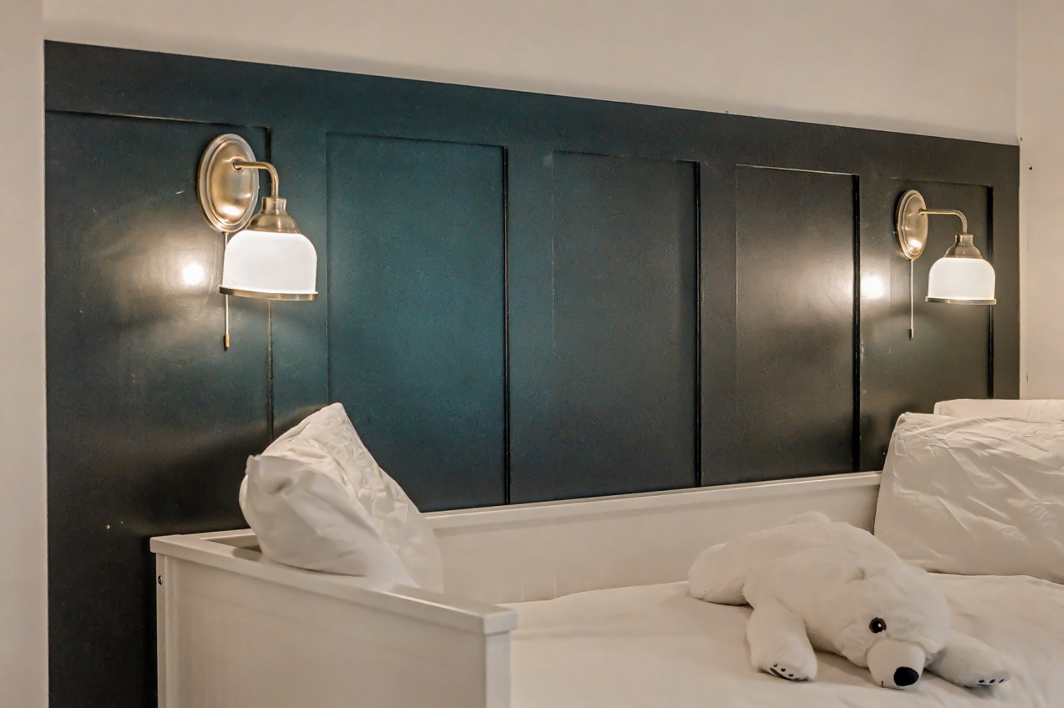 The generous main bedroom sits at the front of the home and boasts high ceilings, elegant crown moulding, a fireplace, bay window, and a beautifully panelled feature wall. The second well-proportioned double bedroom is positioned at the centre of the home, also offering high ceilings, panelled walls, and wall-mounted lighting.