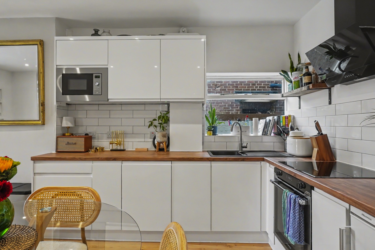 A stylish shower room is finished in muted black tones with brushed brass fittings, while additional under-stairs storage adds everyday convenience. To the rear of the property, a light-filled living space with French doors opens onto the garden, complemented by a smart open-plan kitchen (reconfigured and renovated in 2026). The apartment further benefits from a lean-to storage area accessible from the garden.