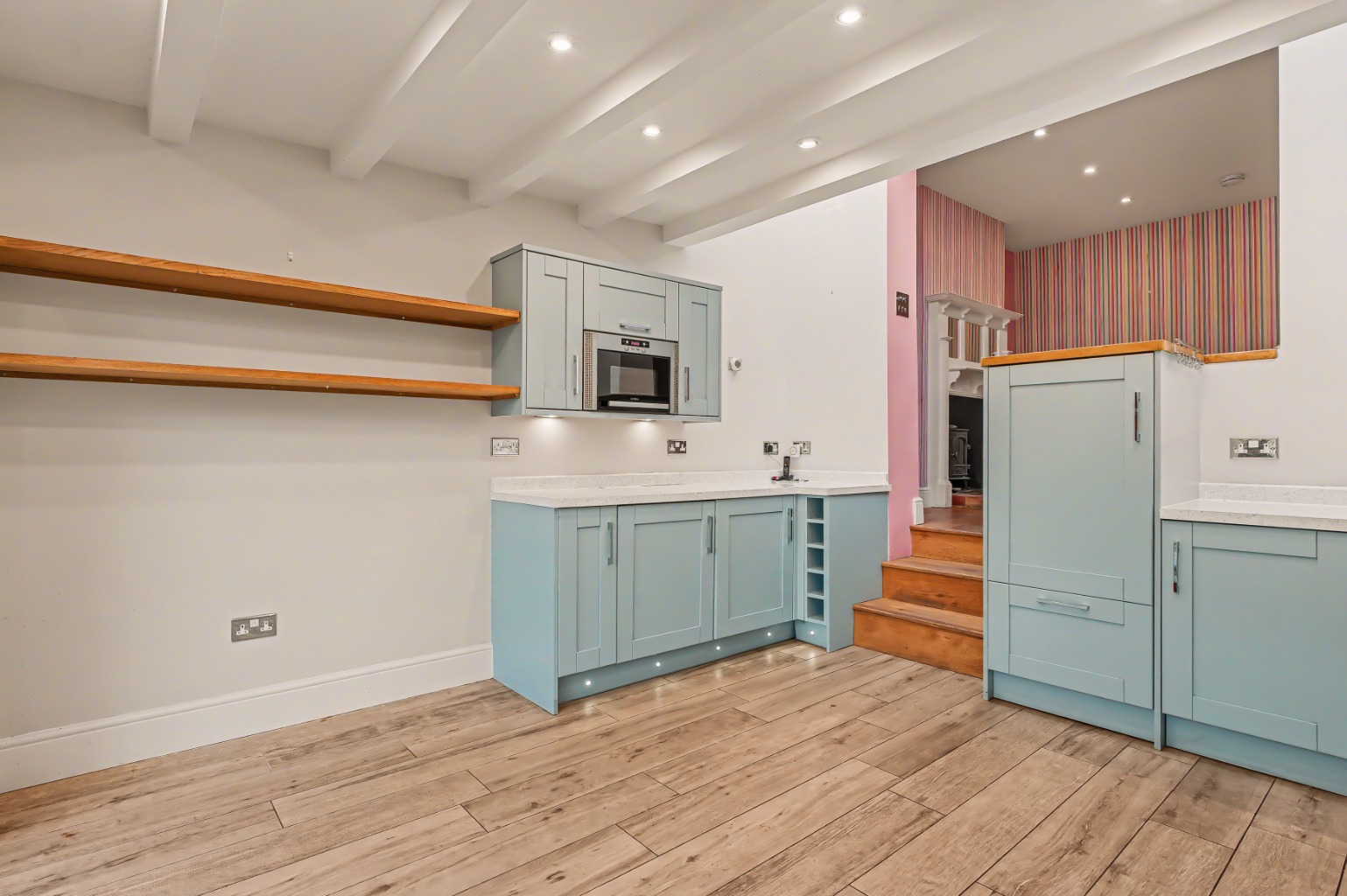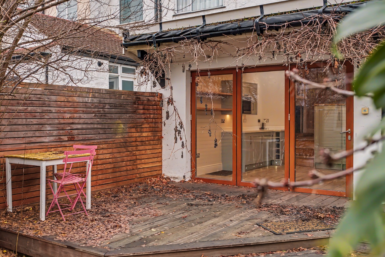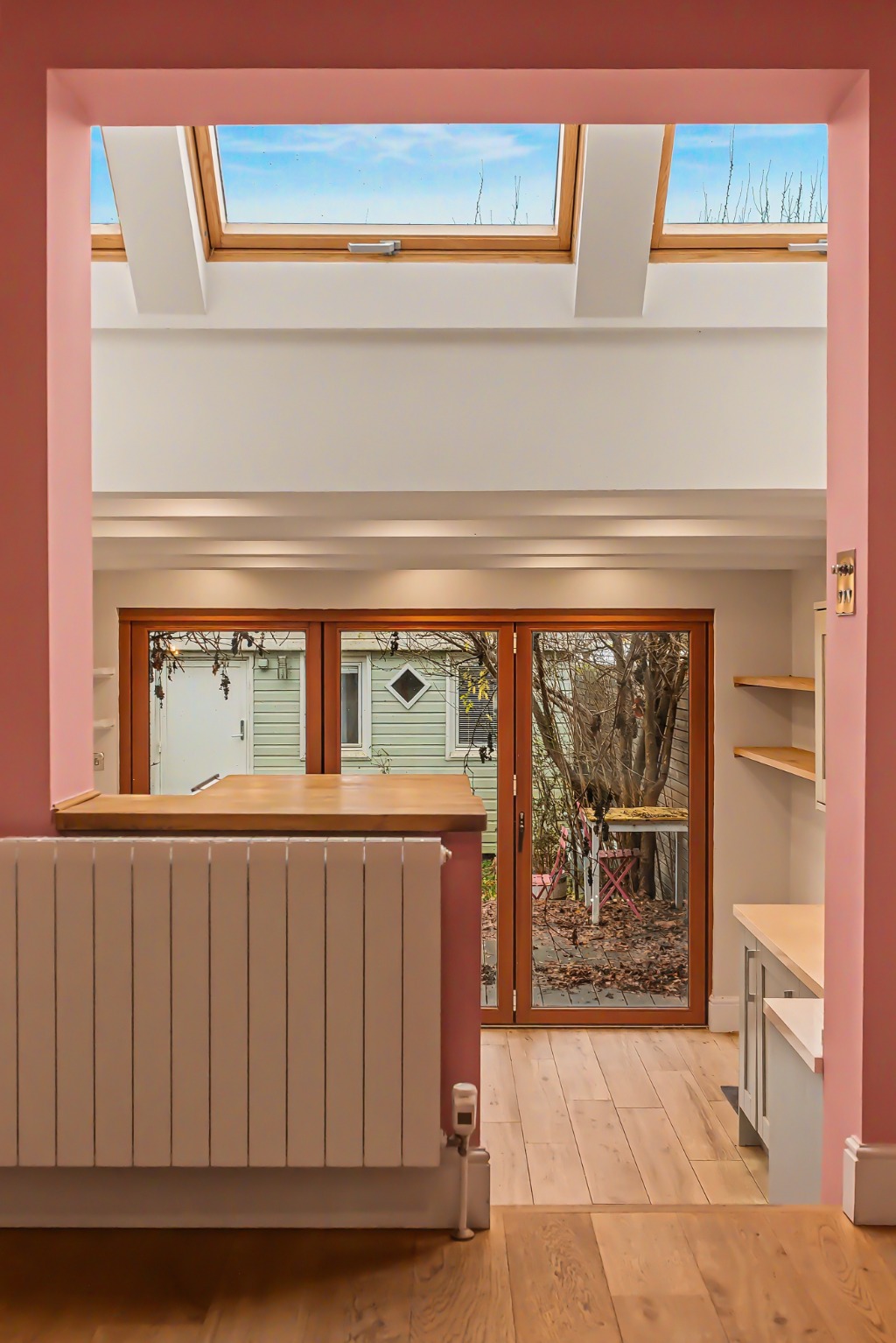 The organic garden has provided much enjoyment for the owners and their young children, featuring a variety of edible fruits and berries. A grape producing vine has been grown to arch over the opening from the kitchen, while a reclaimed butler’s sink sits beneath an outdoor tap — perfect for messy garden play or washing muddy paws. The garden studio offers an excellent work from home space, and the end of terrace position allows for convenient side access directly into the garden. The garage, which is not attached to the house but sits immediately next to the side access, also benefits from a door leading into the garden, making it another versatile space.