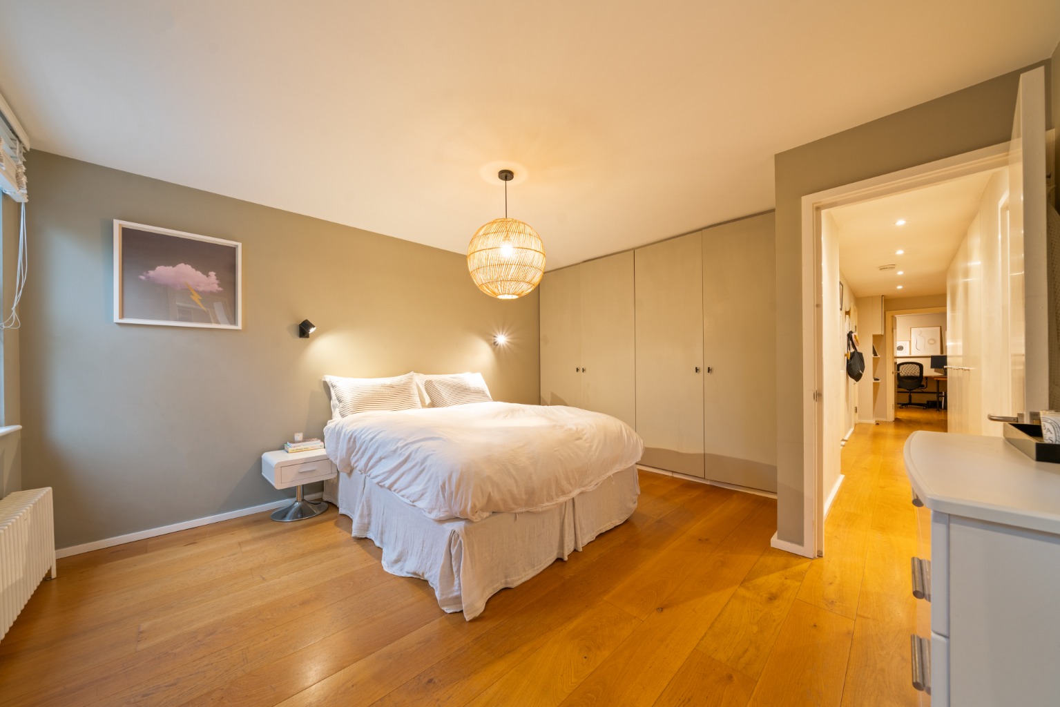 The dual aspect open plan living space is entered via wide double doors from the hallway area and features a large ‘U’ shaped kitchen, dining area and living area. To the front of the apartment, the second bedroom offers a versatile space with fitted storage and a further run of fitted closets lines the hallways as you walk towards the rear of the rear of the home. A bright main bathroom with mirrors and window sits to the left and a stunning principal bedroom with ensuite shower room takes the full width of the back of the apartment, with peaceful green views.