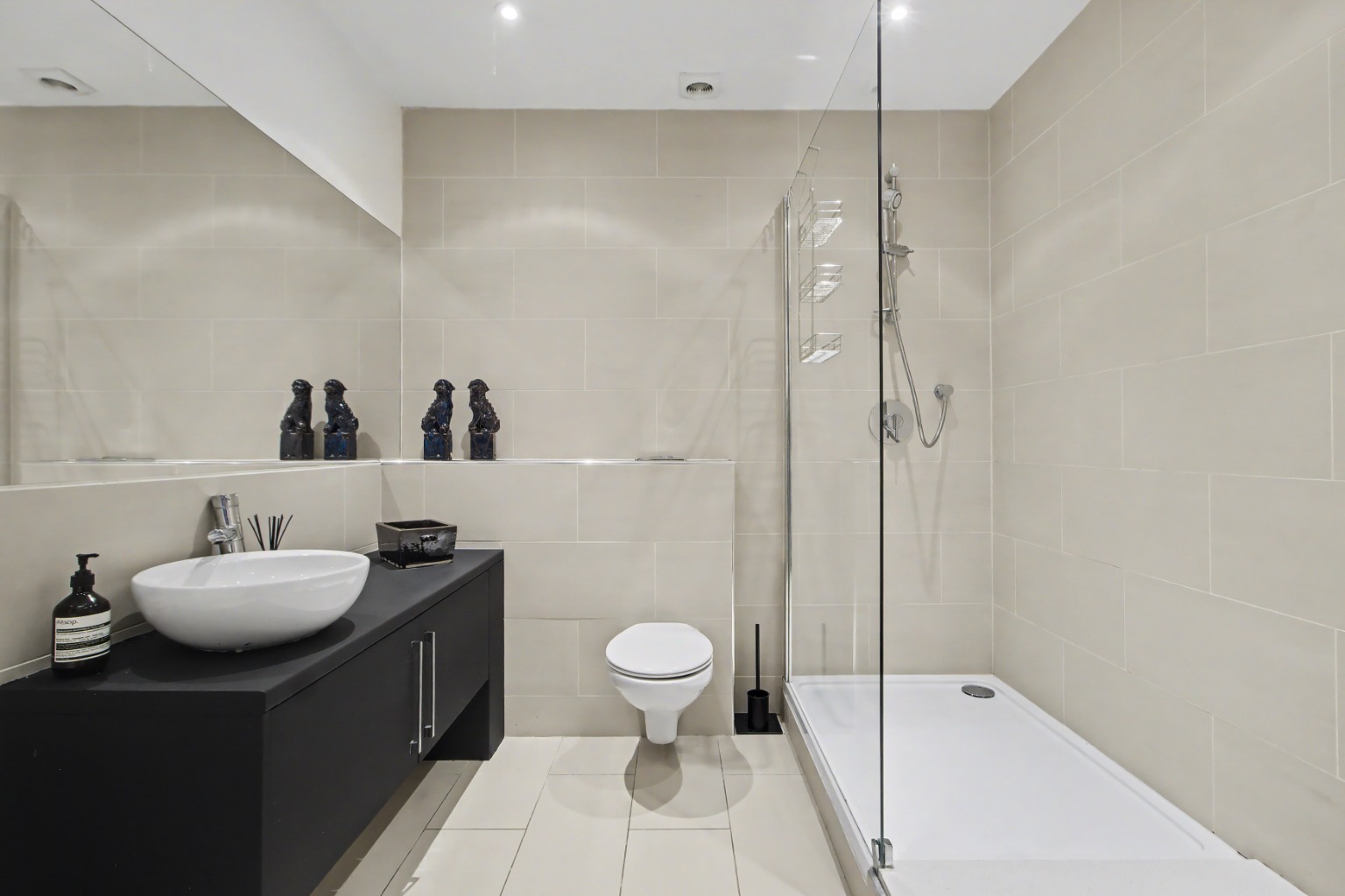Positioned favourably within the building, the apartment combines authentic warehouse features with contemporary finishes. Original Crittall-style doors and generous proportions run throughout, creating a sense of volume and light rarely found. The principal bedroom benefits from an en-suite, complemented by a second double bedroom and a versatile third bedroom, currently arranged as a study/guest room. In total, the property offers three bathrooms, including a recently installed utility/guest bathroom completed prior to Christmas.